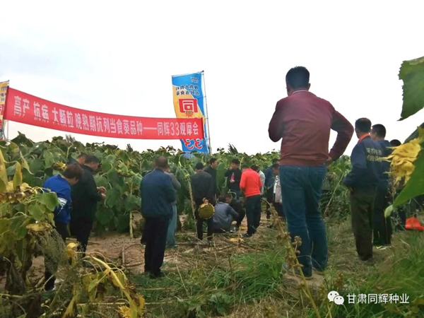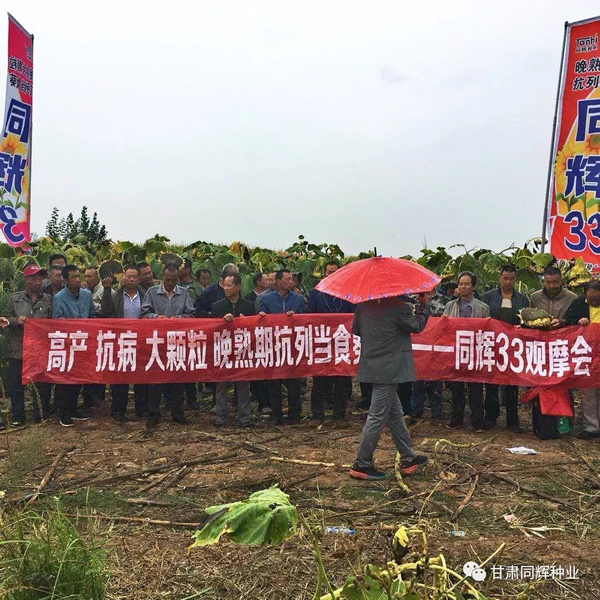 作為一個心系種植戶,以給種植戶選擇最合適的品種,給種植戶解決最緊迫生產(chǎn)問題的公司,同輝種業(yè)從新疆到內(nèi)蒙再到東北,對葵花主產(chǎn)區(qū)做了大量的調(diào)查工作,對各個品種做了深入的分析,同輝33在大災(zāi)之年脫穎而出,抗病,抗倒,結(jié)實率高,籽粒大,籽仁飽滿,黑底白邊亮度好,單盤粒數(shù)多,盤口緊實易收獲……。當(dāng)我們把種植戶帶到地里參觀的時候,飽受傷害的種植戶終于露出了笑臉。