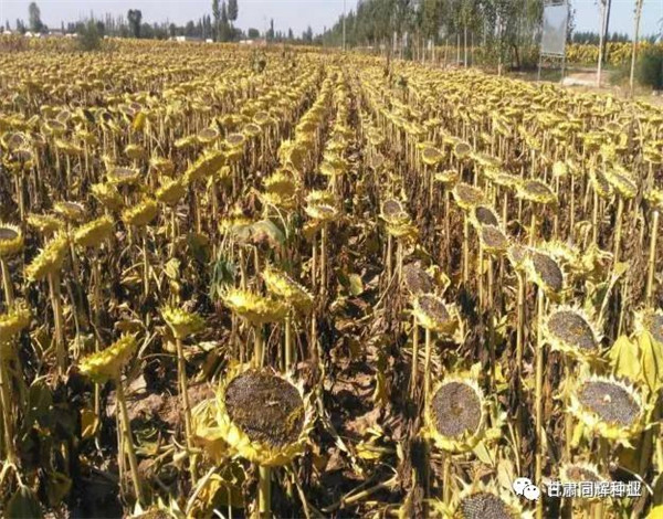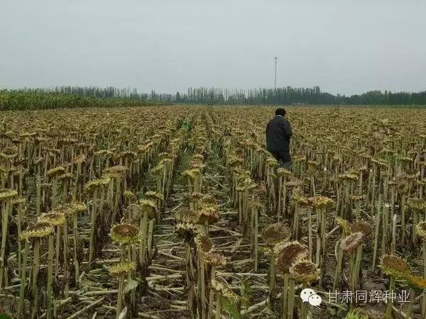 向日葵植株莖桿變黃,大部分葉片枯黃脫落,花盤背面成黃褐色,舌狀花干枯或脫落,籽粒變硬(即含水率30%),并呈現(xiàn)固有色澤,此時(shí)達(dá)到生理成熟階段,是收獲的適宜時(shí)期,可以割盤晾曬或插盤晾曬。